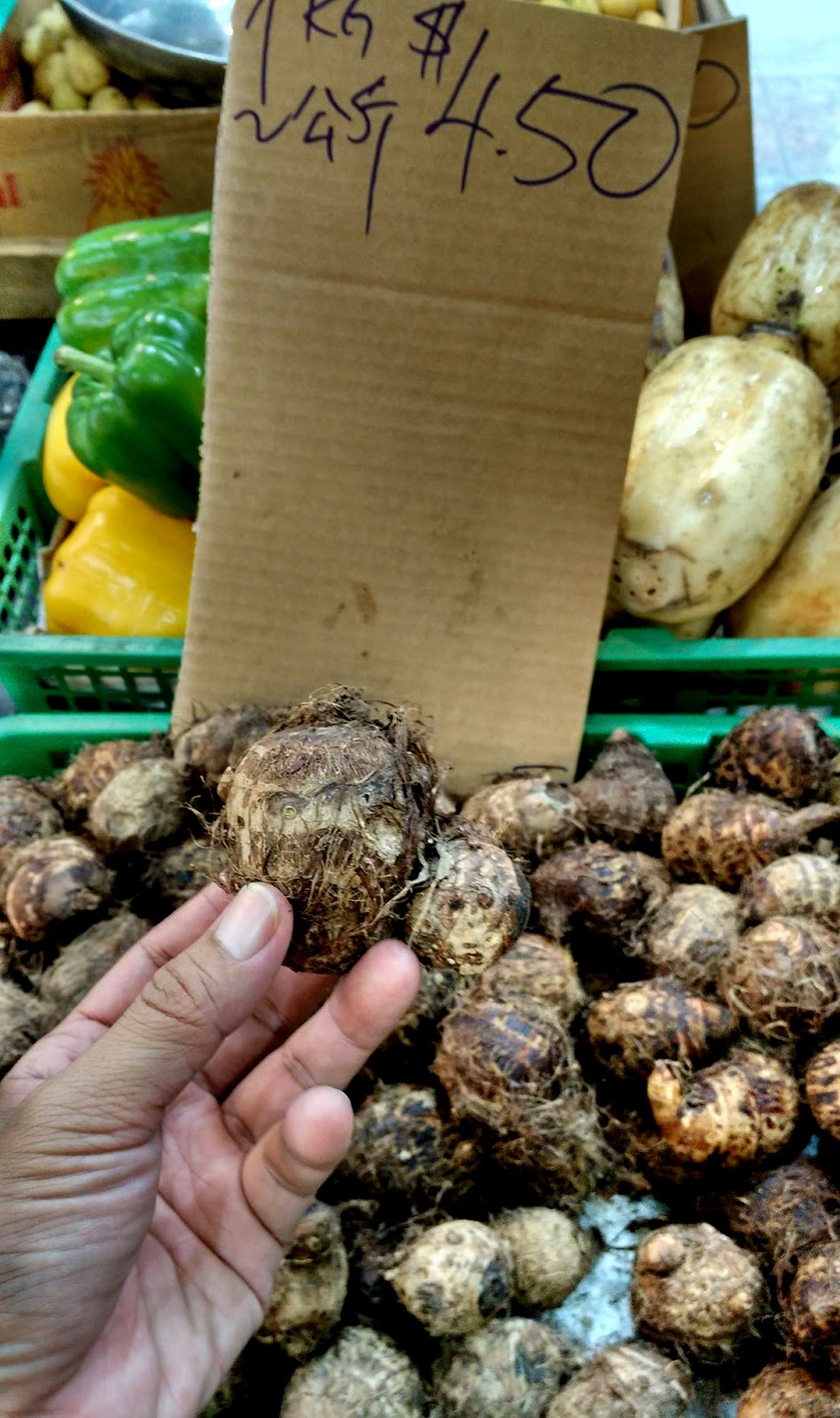 Mbot’he. Itulah nama di kampung saya untuk talas yang wujudnya seperti di foto. Saya menjepretnya pada 14 September 2016 siang, di toko buah dan sayuran, saat mengantar Zak sekolah. Saya tertarik karena harganya yang “wah”, juga jarang-jarang nongol di pasaran sini, Singapura. Di pandangan pertama saya pada mbot’he, tiba-tiba juga membangkitkan ingatan saya di masa bocah/remaja.