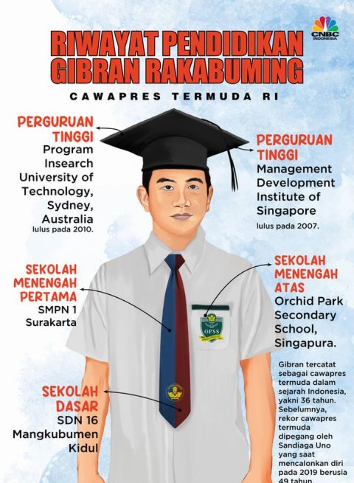 Sebagaimana penjelasan infografis dari situs CNBC Indonesia ini :(https://www.cnbcindonesia.com/lifestyle/20231025191343-36-483719/riwayat-pendidikan-gibran-rakabuming-cawapres-termuda-ri/amp).